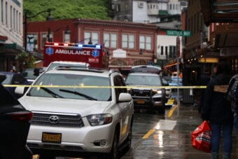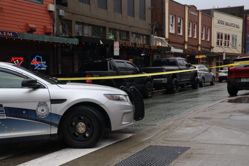 Caution tape blocks off an area of downtown Juneau after witnesses say police shot a man on July 15, 2024. (Clarise Larson/KTOO)