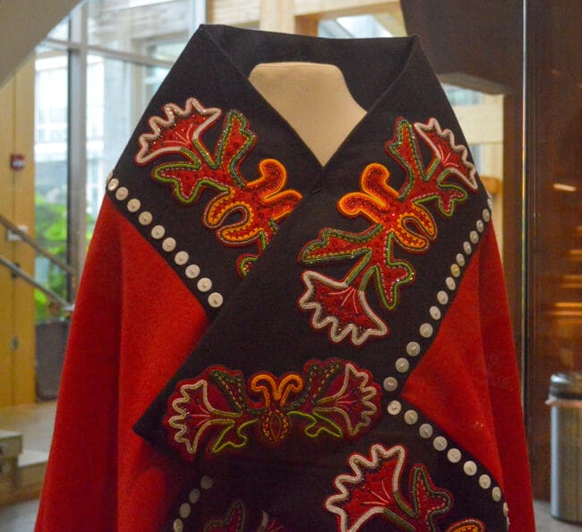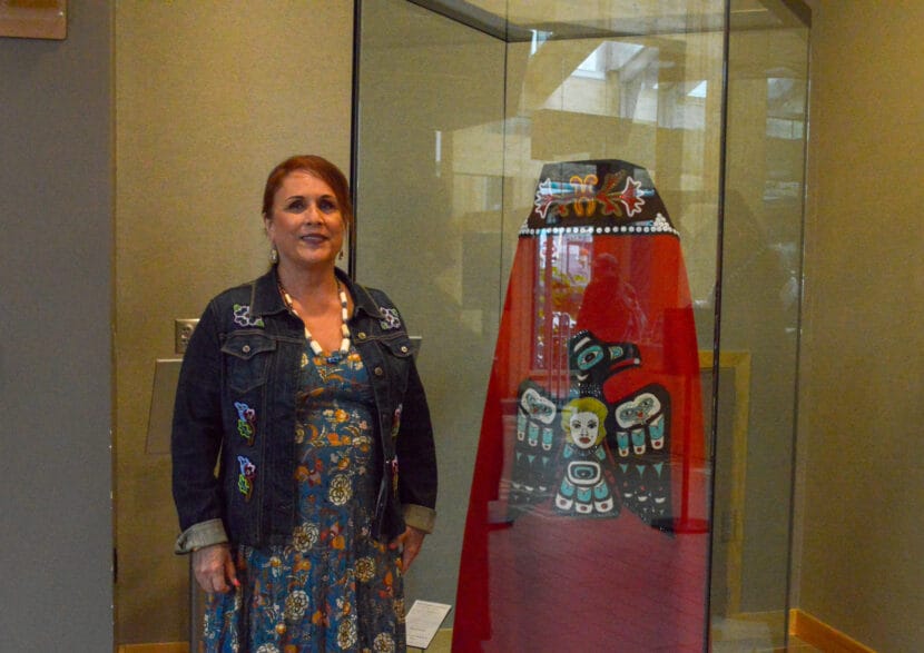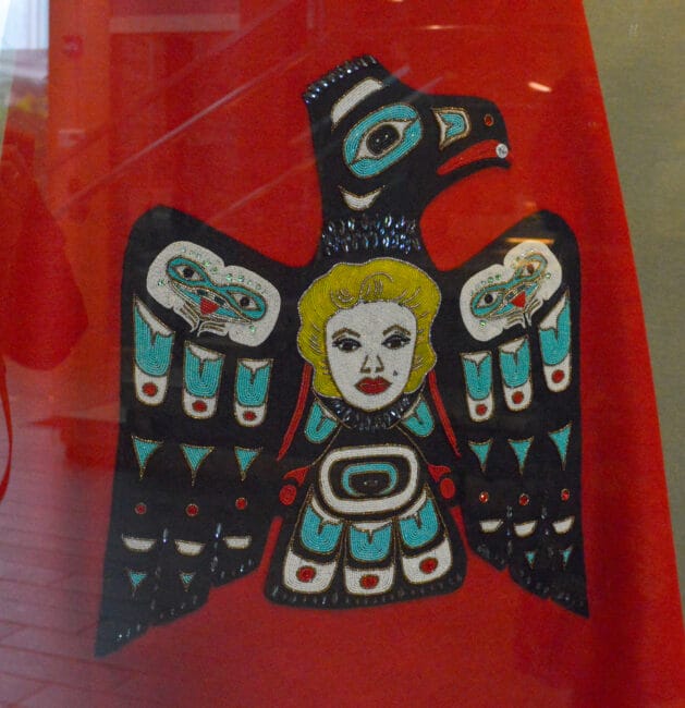 And so the two white frogs in my Raven, on the shoulders represent my name and the seaweed designs represent the location of where I’m from, and each clan has ownership of different designs, so you can tell where they were from, and that’s what Lingít art is about. It says where you’re from, and who you’re from, and what, what your name is, and and what you own, what you don’t own, where you’ve been, where you’re going.