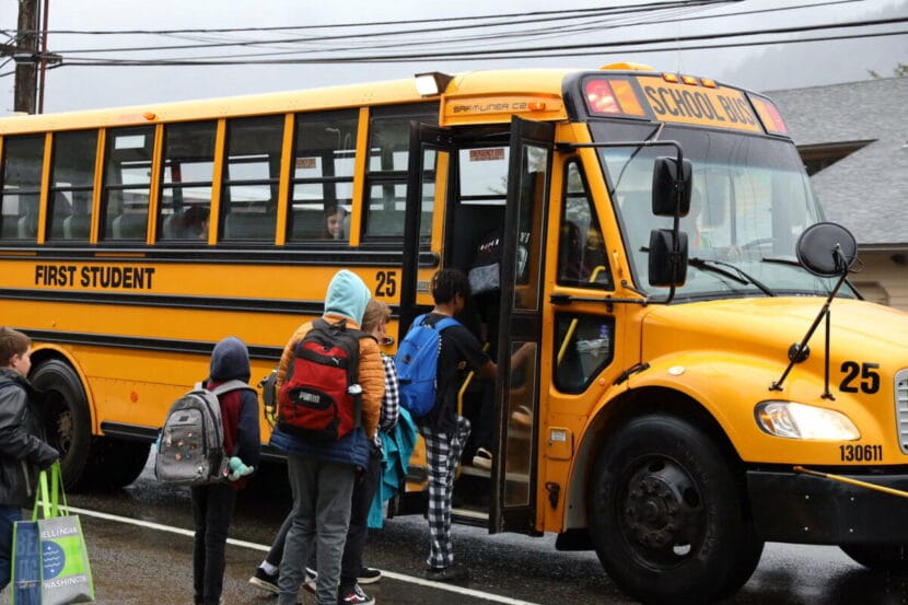 Students enter a bus stopped on Douglas Highway during the first day of the 2023-2024 school year. (Clarise Larson/for the Juneau Empire)