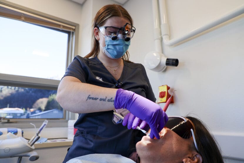 On Thursday in Juneau, Dr. Yvonne Tijerina-Burleson used a tiny brush to paint topical fluoride on a patient’s teeth at SouthEast Alaska Regional Health Consortium’s Dental Clinic. She explained what she was doing out loud.