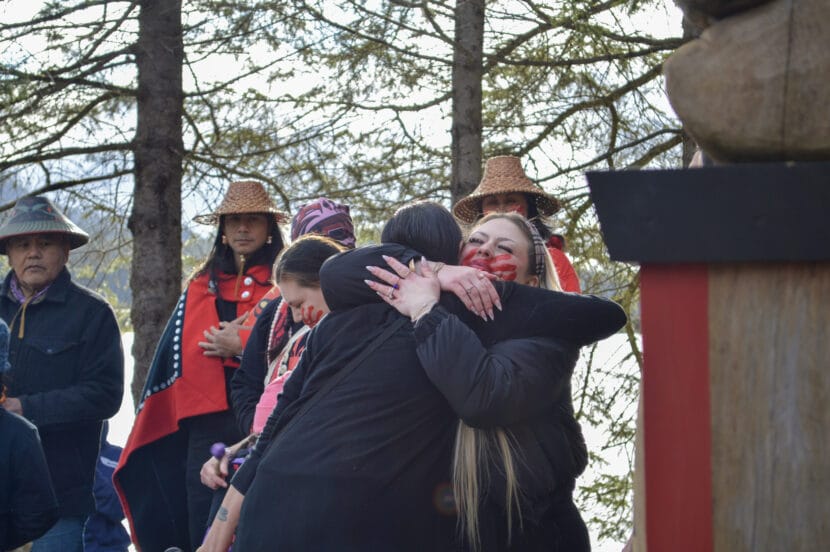 Tracy Day’s daughter Kaelyn Schneider hugs MMIP advocate Jamiann S’eiltin Hasselquist at the Kaasei Healing Kootéeyaa on May 5, 2025. (Photo by Yvonne Krumrey/KTOO)