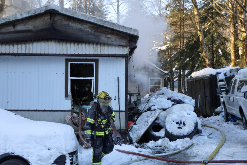 Firefighters exit a residential fire at the Switzer Village Mobile Home Park in Lemon Creek on Monday, Dec. 22, 2025. (Photo by Clarise Larson/KTOO)