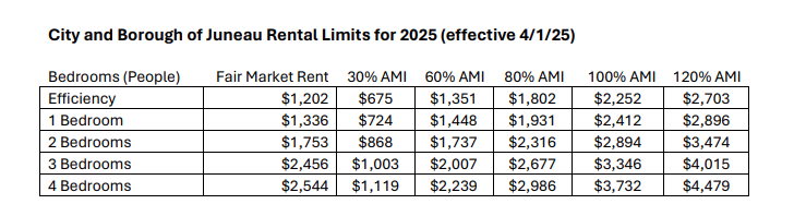 The city uses a formula based on Juneau’s income data to determine eligibility for affordable housing programs. People qualify as “low-income” if their household or individual income is at or below 80% of the Area Median Income. In Juneau in 2025, 80% AMI for a single person is $72,080 and $102,960 for a four-person household.