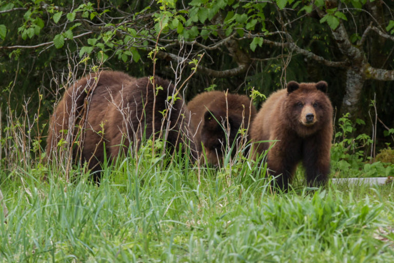 A sow brown bear walks with two cubs through the forest at Pack Creek on Admiralty Island in Southeast Alaska on Wednesday, May 26, 2021. (Nat Herz/Alaska Public Media)