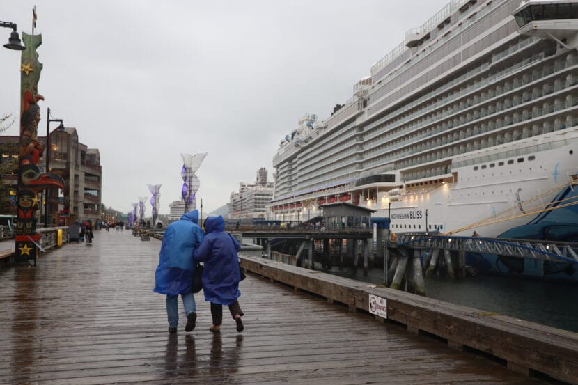 Visitors brave the rain as they head back to their cruise ships in Juneau on Monday, Sept. 30, 2024. (Clarise Larson/KTOO)