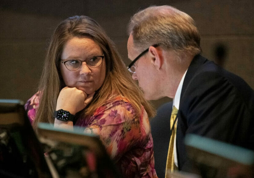 Municipal Manager Amy Demboski speaks with Mayor Dave Bronson during the Anchorage Assembly meeting at the Loussac Library on Tuesday, June 7, 2022. (Emily Mesner/ADN)