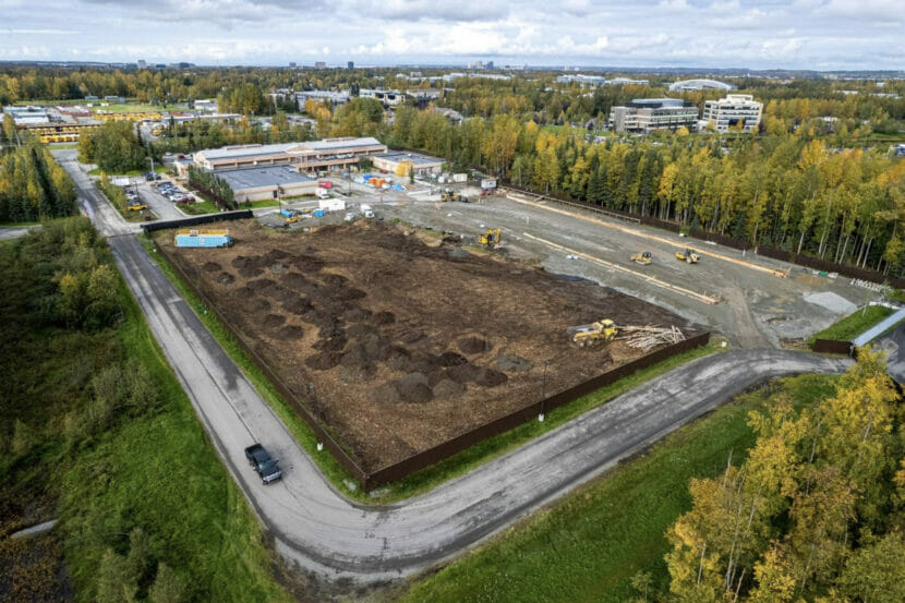 Construction was underway on Sept. 14, 2022 for the East Anchorage homeless navigation center and shelter, adjacent to the former Anchorage Police Department headquarters near the intersection of Tudor Road and Elmore Road. (Loren Holmes/ADN)