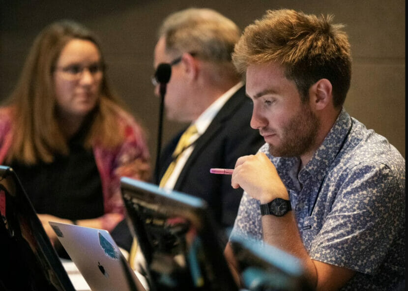 Brice Wilbanks photographed during an Anchorage Assembly meeting at the Loussac Library on Tuesday, June 7, 2022. (Emily Mesner/ADN)