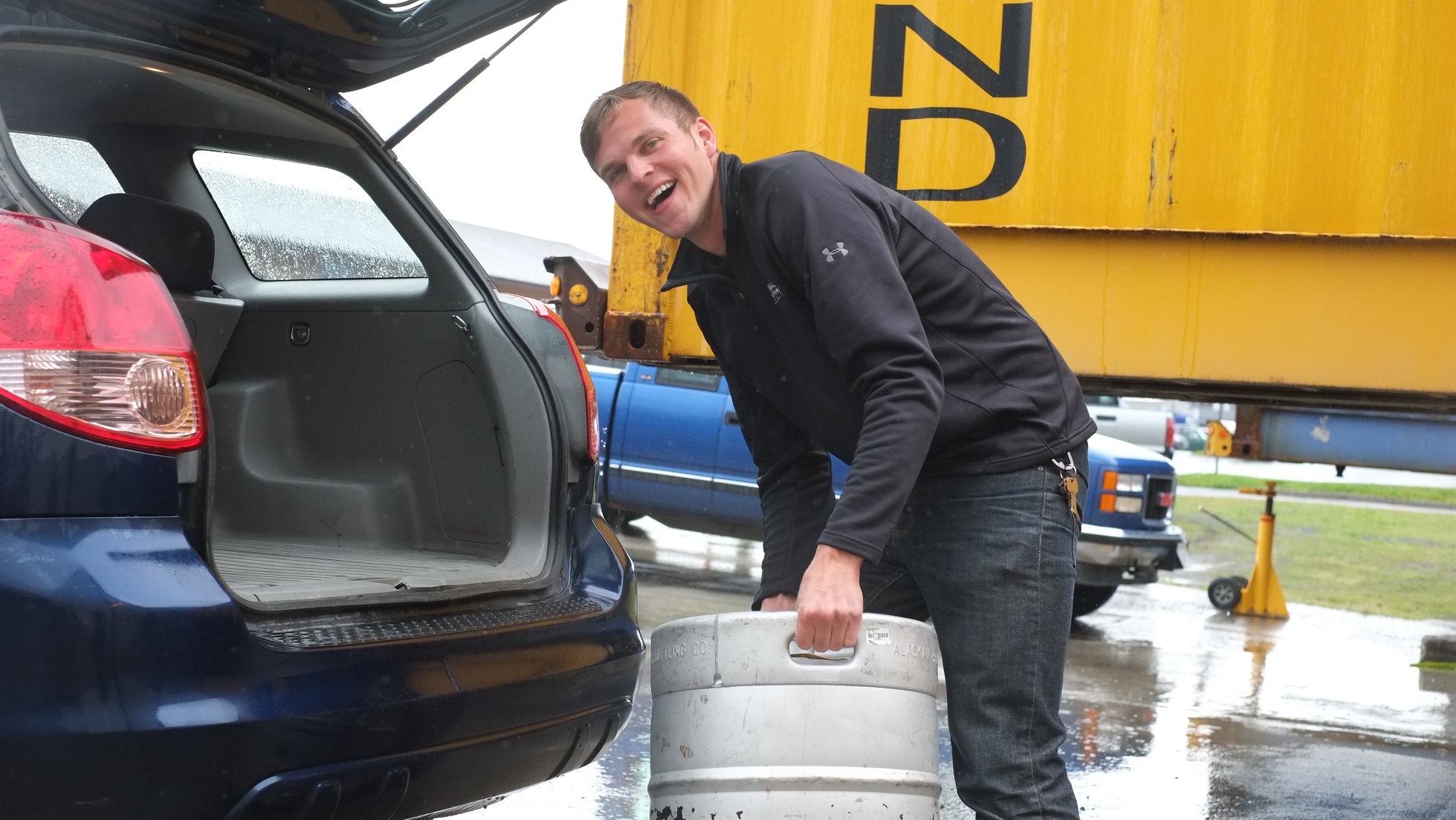 Jake Quarstad loads up a keg of APA donated by the Alaskan Brewing Co. for tonight’s Trampled by Turtles performance at Centennial Hall. Photo by Annie Bartholomew/KTOO