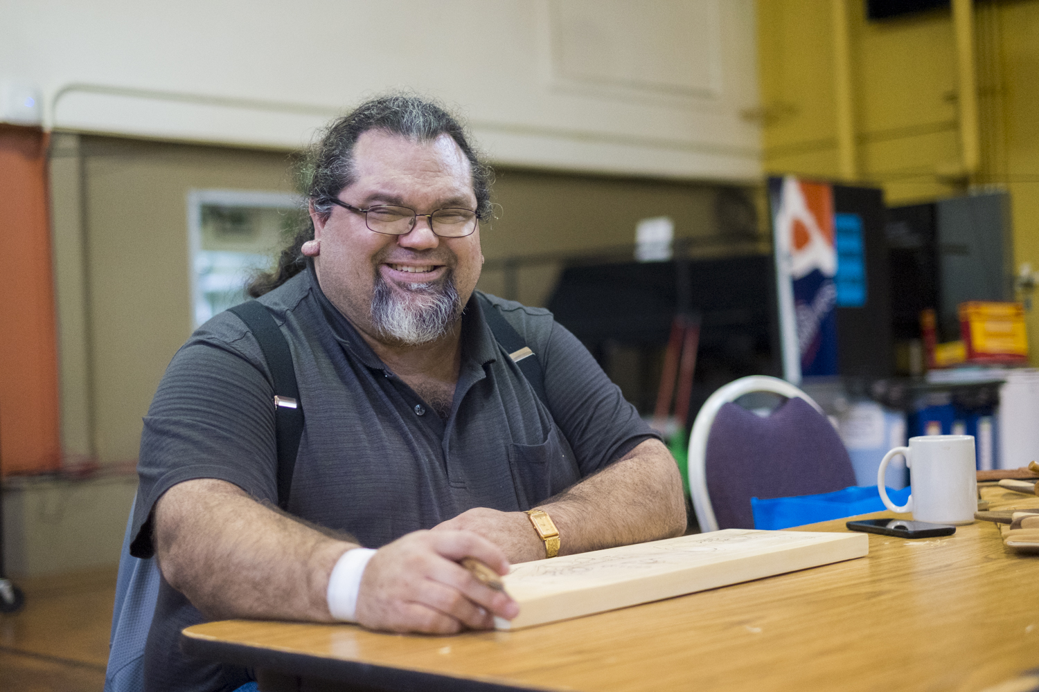 Juneau artist and University of Alaska Southeast professor Abel Ryan works on a carving at Artist of All Nations, a open studio and community art space happening once-a-month at the JACC. (Photo by Annie Bartholomew/KTOO)