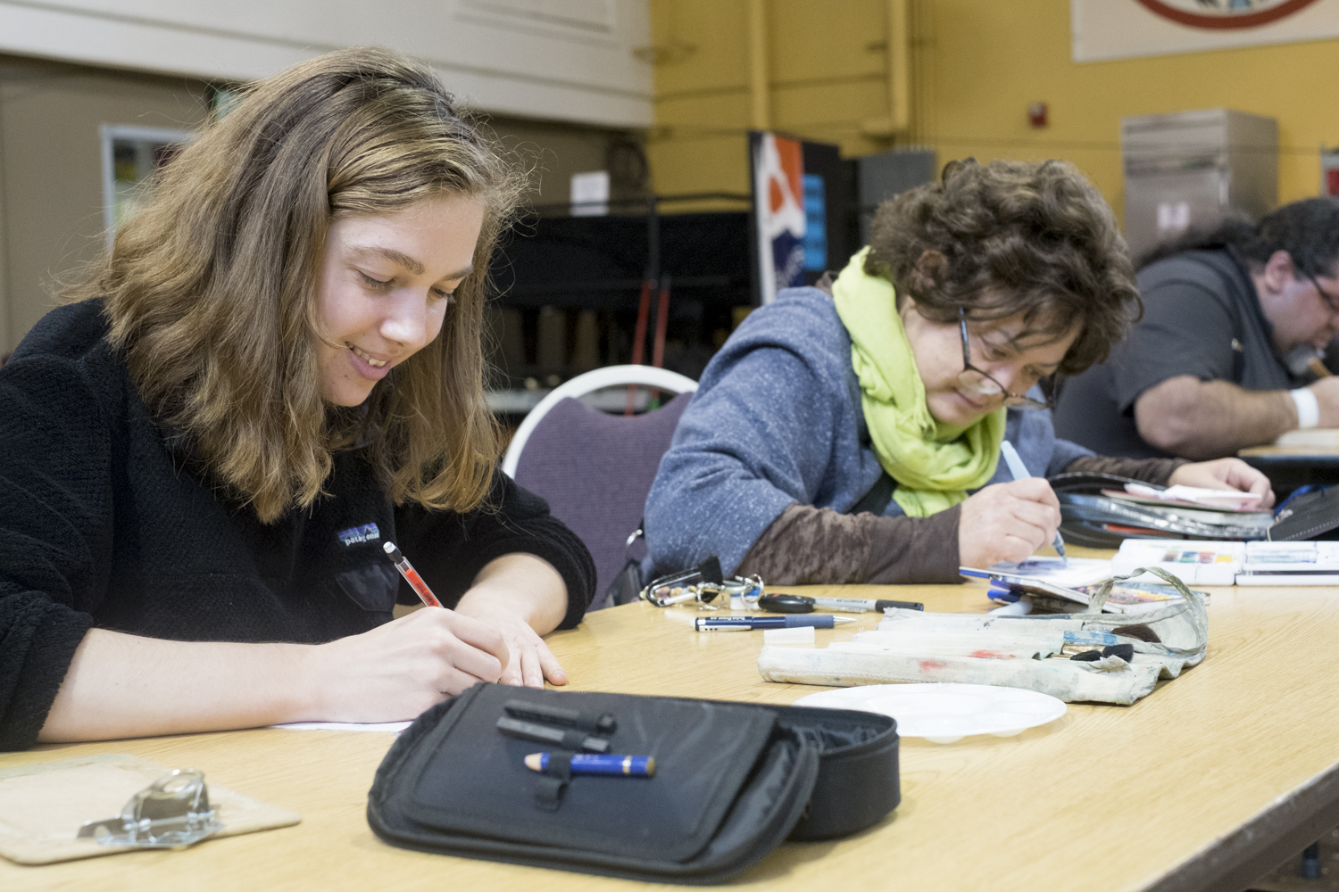 More than 20 artists gathered at the JACC for Artists of All Nations, a monthly creative space open to all artists and mediums. Juneau artists Crystal Cudworth and Pua Maunu of the Plein Rain Painters works on projects Sep. 24, 2017. (Photo by Annie Bartholomew/KTOO)
