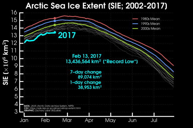 This winter, Arctic sea ice extent is at record lows. (Graphic Courtesy of Zack Labe/UC Irvine)