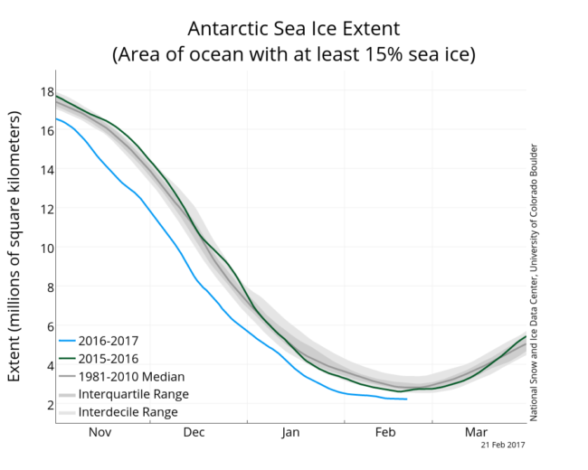 It’s important to remember that it’s summer right now in the Southern Hemisphere, but still, Antarctica’s record low is for any day of the year since 1979 when they started keeping satellite records.