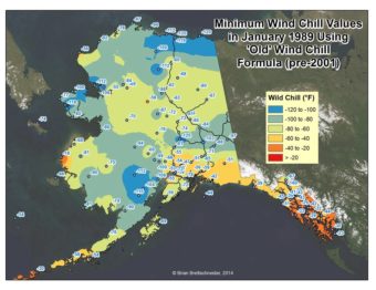 The National Weather Service calculates wind chill by combining apparent — or actual — air temperature and wind speed. In January 1989 chills as low as minus 120 were registered on the North Slope.
