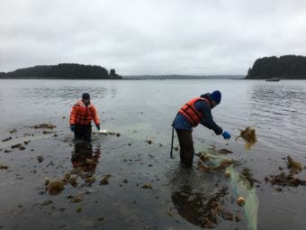 Fisheries biologist Mike Litzow tosses kelp out of the net he uses to catch young cod. (Photo by Mitch Borden/KMXT)