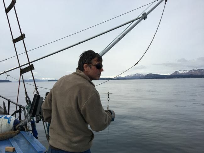 Darius Kasprzak fishes for cod in the Gulf of Alaska. (Photo by Annie Feidt/Alaska’s Energy Desk)