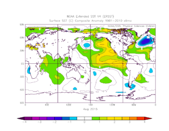 This map shows the blob, (in green and yellow) in Aug. 2015. (Image courtesy of Rick Thoman/NWS Alaska)