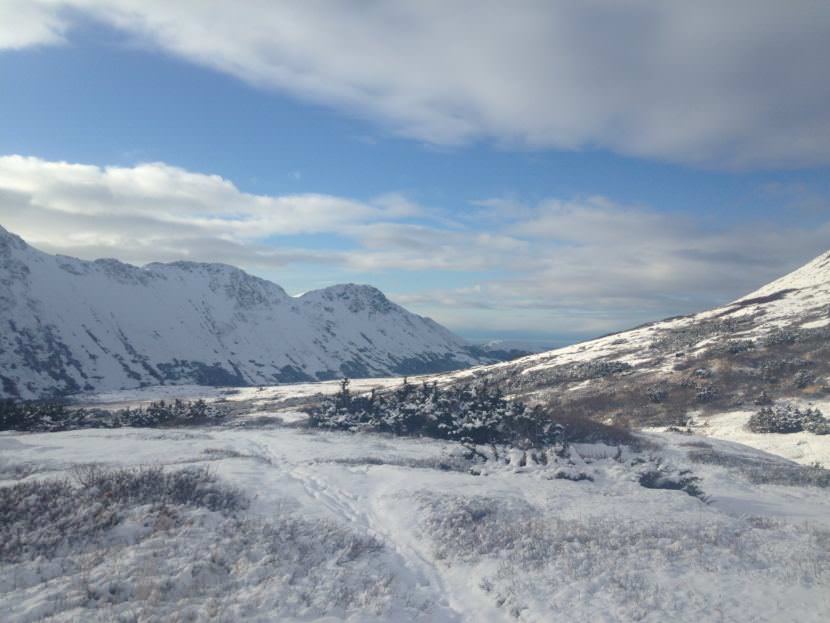 Snow blankets the hidden lake trail above Anchorage, Oct. 22, 2017. (Photo by Elizabeth Harball/Alaska’s Energy Desk)