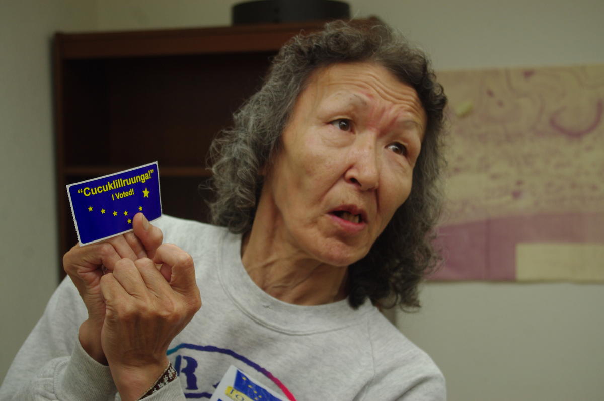 Sally Williams uses a sticker that says cucuklillruunga, or “I voted” in Yup’ik to teach the phrase at the Togiak voting site on Aug. 16, 2016. (Photo by Molly Dischner/KDLG)