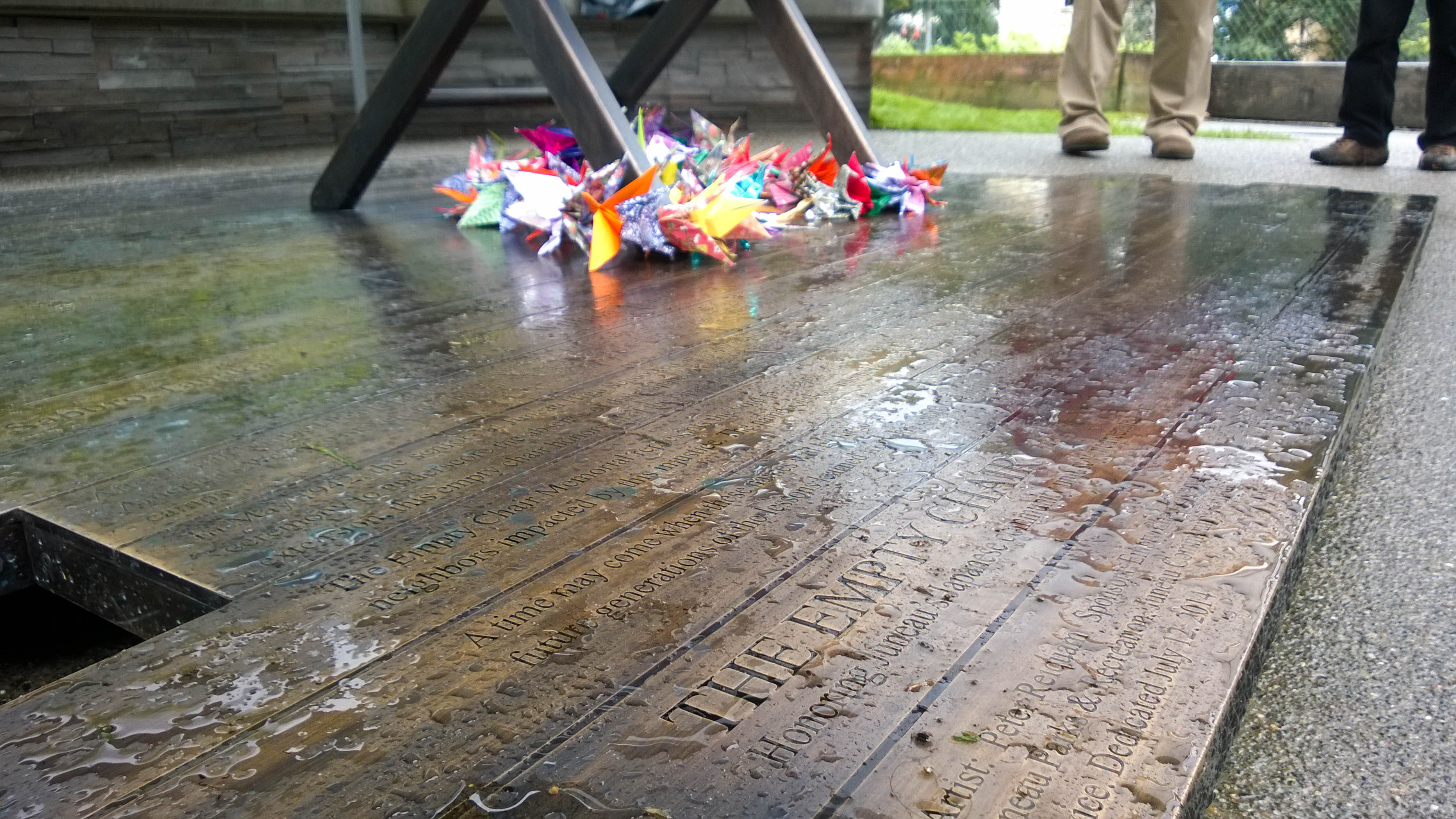 The Empty Chair statue was created by artist Peter Reiquam. The names of 53 Japanese-American internees from Juneau are etched onto its bronze floor.