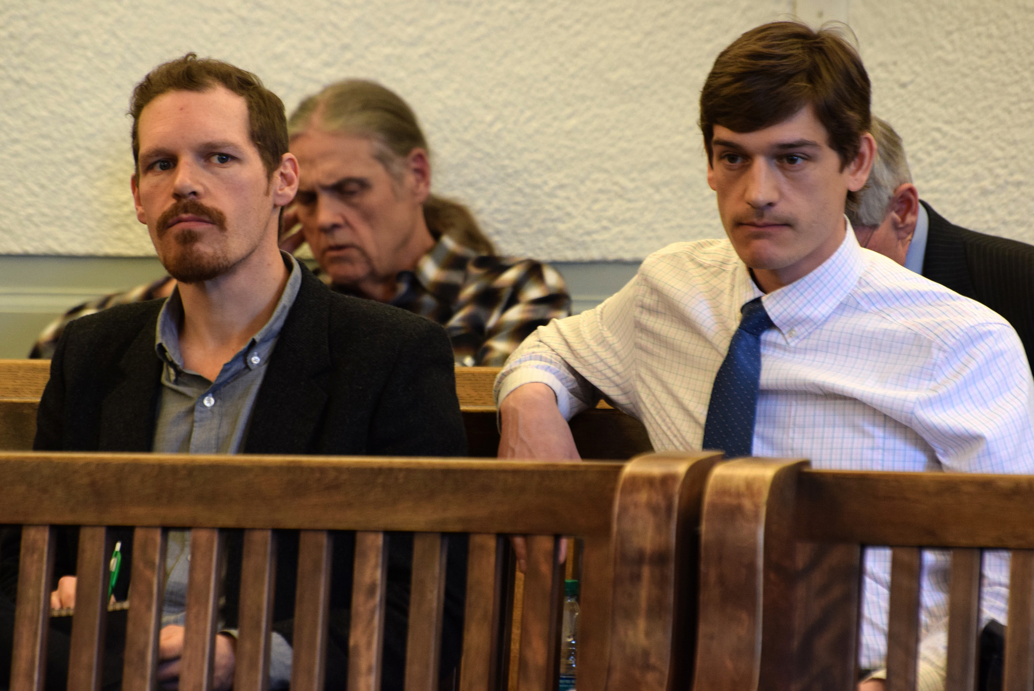 Brothers Giono (left) and James Barrett listen to testimony about Senate Bill 30, which deals with marijuana legalization, in a Senate Finance Committee meeting, March 11, 2015. They had testified earlier. (Photo by Skip Gray/360 North)