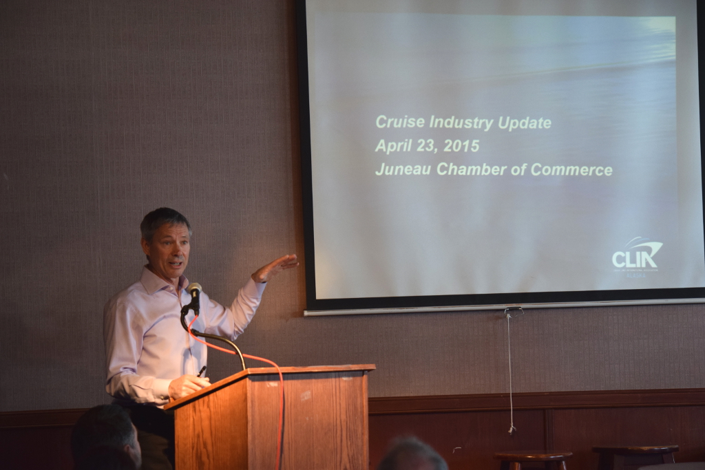 John Binkley, president of Cruise Lines International Association Alaska, speaks to the Juneau Chamber of Commerce on Thursday. (Photo by Casey Kelly/KTOO)