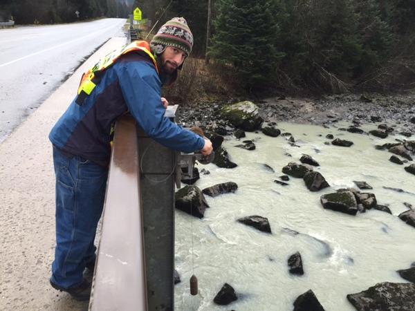 Hydrologist Aaron Jacobs takes the final Mendenhall River reading of 2014 in November. (Photo courtesy National Weather Service)