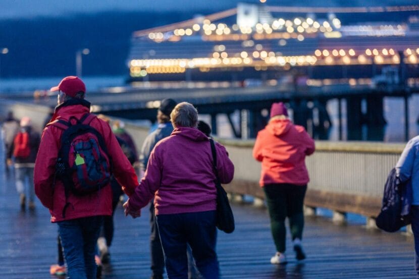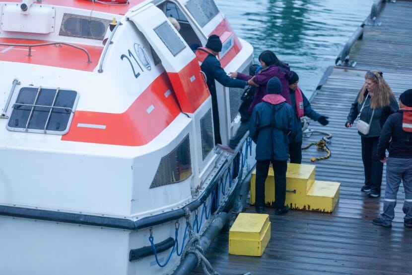 Some 150 people climbed down the stairs and slowly made their way down the dock – a handful stopping to photograph themselves in front of the Haines sign before climbing onto tender boats – basically water shuttles – bound for the nearby Holland America Koningsdam.