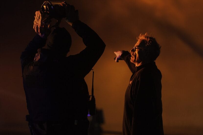 Haines Police’s Michael Fullerton (left) listens to Mike Ward as the two watch four of Ward’s stores burn down on Saturday, Oct. 5, 2024, in Haines, Alaska. (Rashah McChesney/Chilkat Valley News)