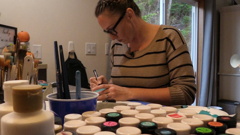 Heather Stemmerman uses paint pens for the fine details on the rocks she paints (Photo by David Purdy/KTOO)