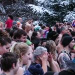 Swimmers wait before the 2018 New Year’s Day Polar Bear Plunge at Auke Rec (Photo by David Purdy/KTOO)