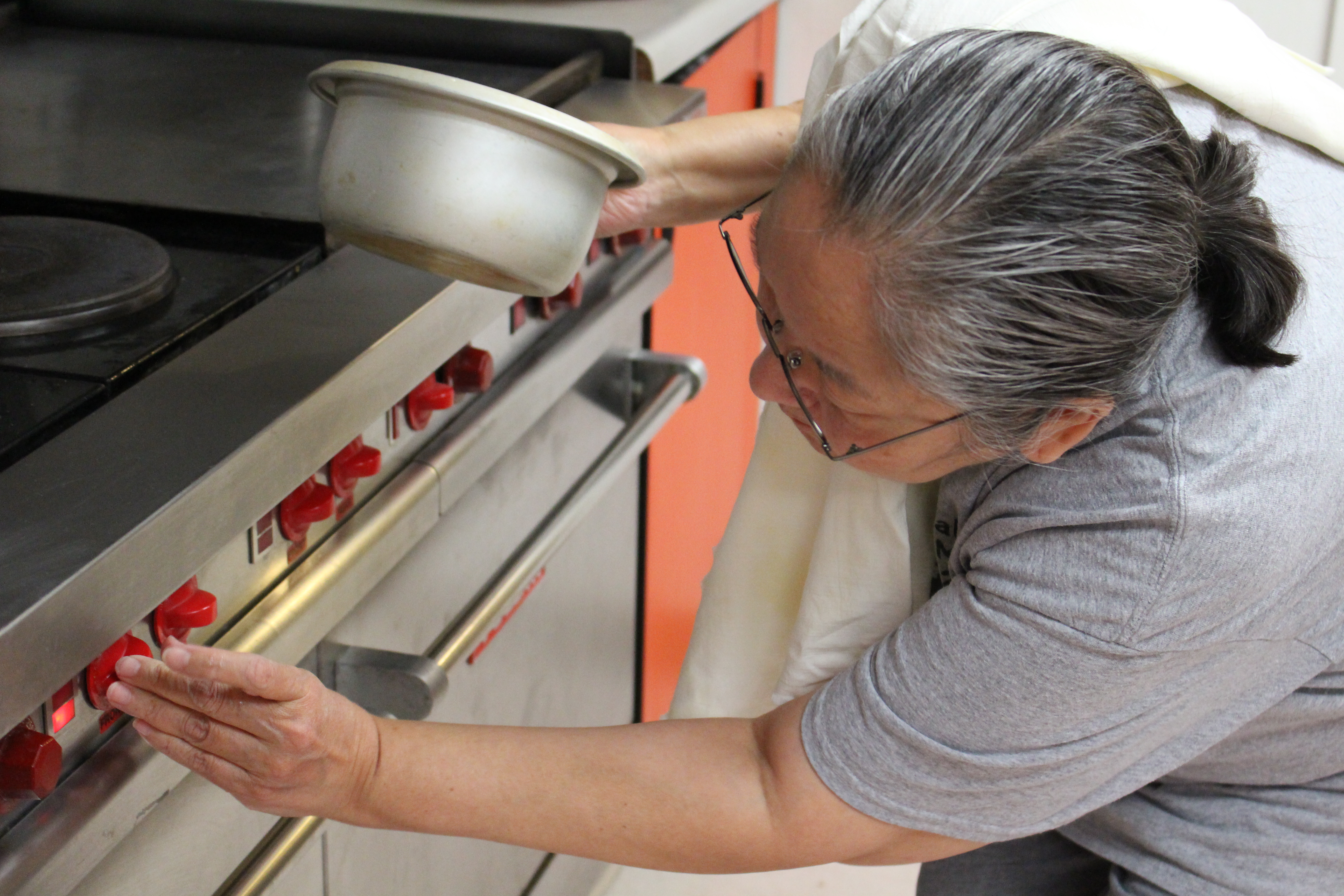 In the kitchen of the Juneau Tlingit Haida Community Council Building, she sifts flour and sugar into a large mixing bowl. Adding a dab of salt.