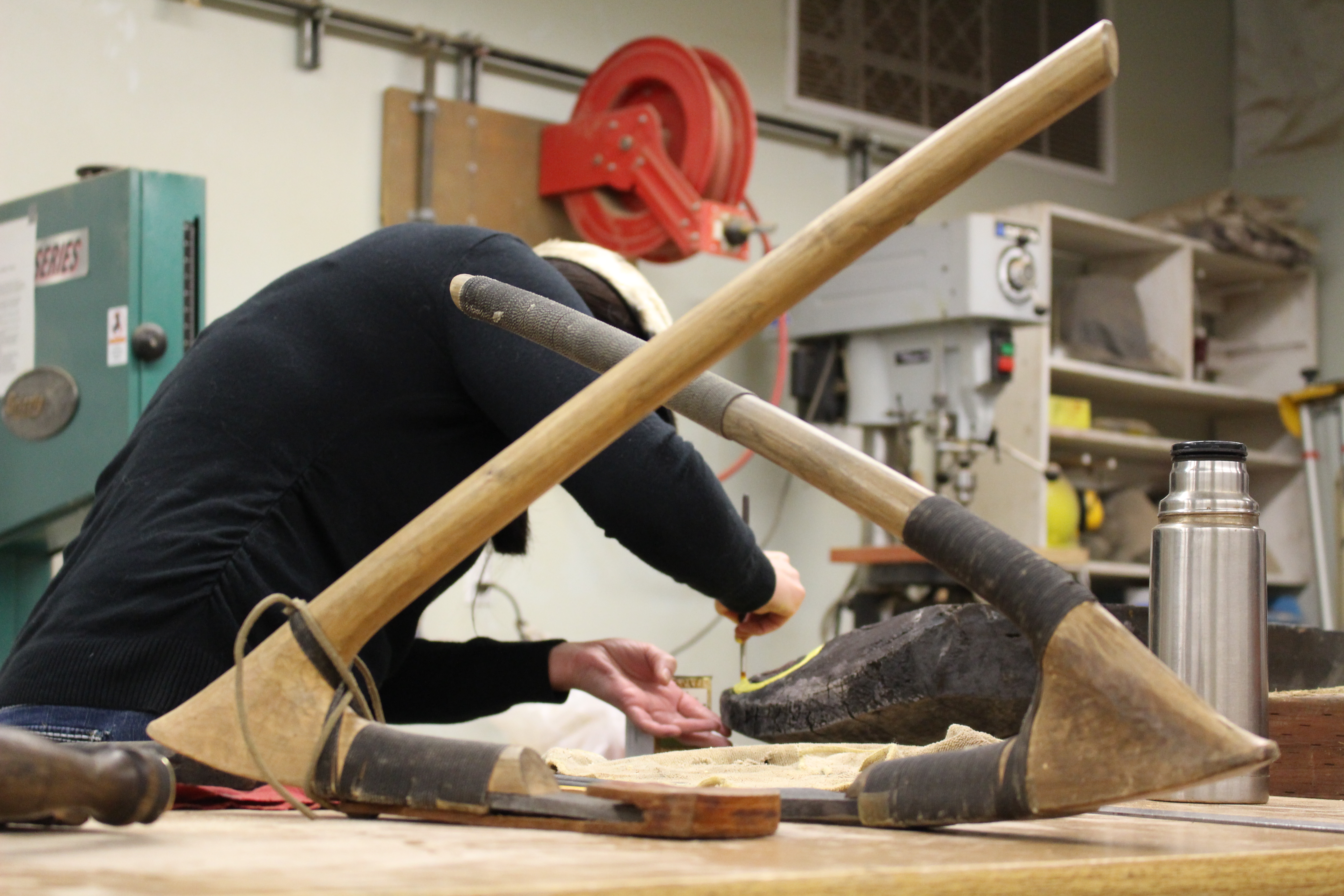 The tools of the trade: a pair of elbow adzes used to restore the totem. (Photo by Elizabeth Jenkins/KTOO)