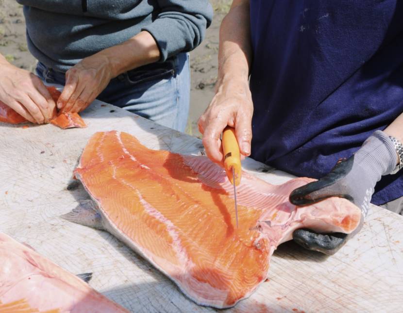 Cutting the salmon at fish camp on the Yukon River in Alaska.(Photo by Meghan Sullivan, Indian Country Today)