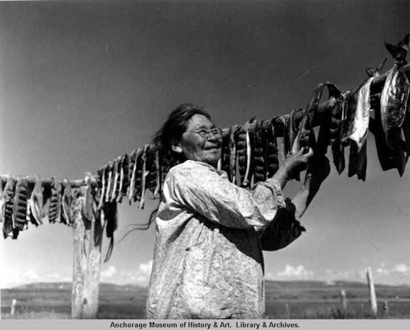 An elder hangs salmon during the 1950s. (Photo courtesy of University of Alaska, Fairbanks).