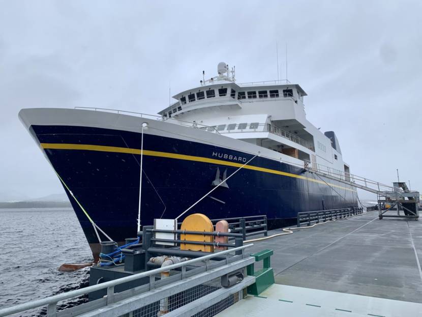 This $60 million Alaska Class Ferry was recently built in Ketchikan. But the Hubbard has yet to enter service in the Alaska Marine Highway System and remains tied up at a private dock on Ketchikan’s Ward Cove. (Eric Stone/KRBD)