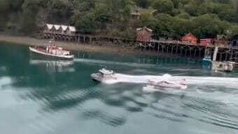 A video from Aug. 23 shows an aluminum boat circling a 1955 de Havilland Beaver as the wake rocks the small aircraft as it tries to leave the cove. The floatplane was taxiing back into the bay with the pilot, Eric Lee, and seven passengers on board.