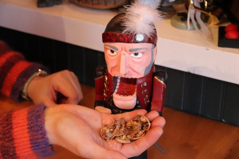 Reaching into a basket of walnuts, Petersen plucks one out and places it into the nutcracker’s mouth, preparing for a satisfying crack.