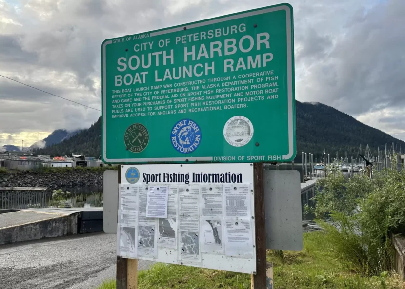 Sport fishing advisory announcements hang on a dockside information board at Petersburg’s South Harbor. (Photo by Olivia Rose/KFSK)