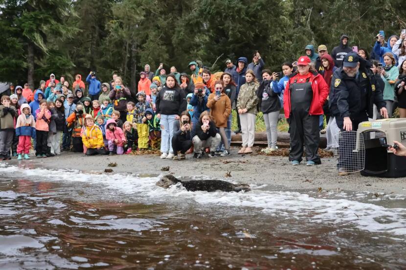 Over 100 people gathered on Sandy Beach in Petersburg to see off the rescued seal on Oct. 23, 2025. (Olivia Rose/KFSK)
