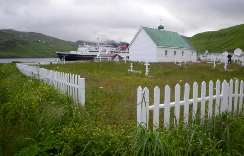 The Alaska Marine Highway System ferry Tustumena sits at the dock in Akutan on the Alaska Peninsula, July, 28, 2012. (Photo by David Waters/KTOO)