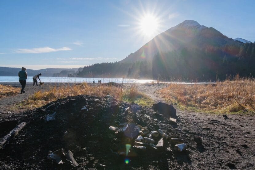 One of several ash piles near the entrance to White Sands Beach near Kodiak. The beach is a popular spot for bonfires, fishing, bear watching, walks, or letting dogs run around off-leash. (Brian Venua/KMXT)
