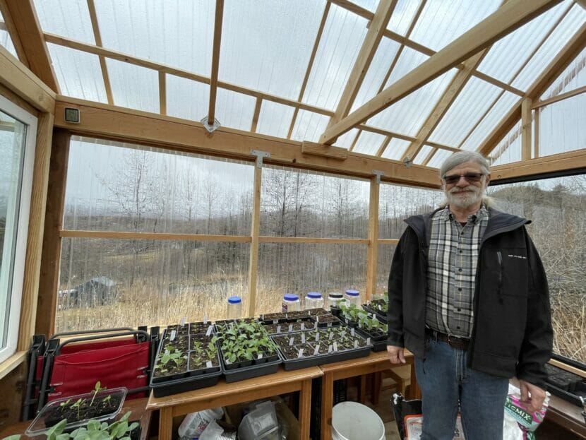 Dave Jackson in his greenhouse at his home in Bell’s Flats. Jackson grows carrots indoor and outdoors, along with other vegetables. (Kirsten Dobroth/KMXT)