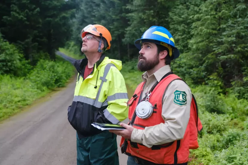 Tom Roland, Forest Service Silviculturist, and Jim Kaufmann, director of capitol grounds and Arboretum at the Architect of the Capitol, evaluate a candidate tree on the Wrangell Ranger District of the Tongass National Forest for potential selection as the 2024 U.S. Capitol Christmas Tree. (Courtesy of U.S. Forest Service)