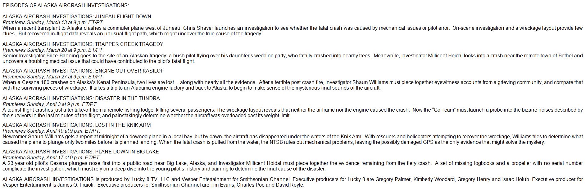 Episode descriptions allude to information that hasn’t been released to the public. The description of the episode on last July’s Wings of Alaska crash that occurred between Juneau and Hoonah says, “recovered in-flight data reveals an unusual flight path, which might uncover the true cause of the tragedy.”