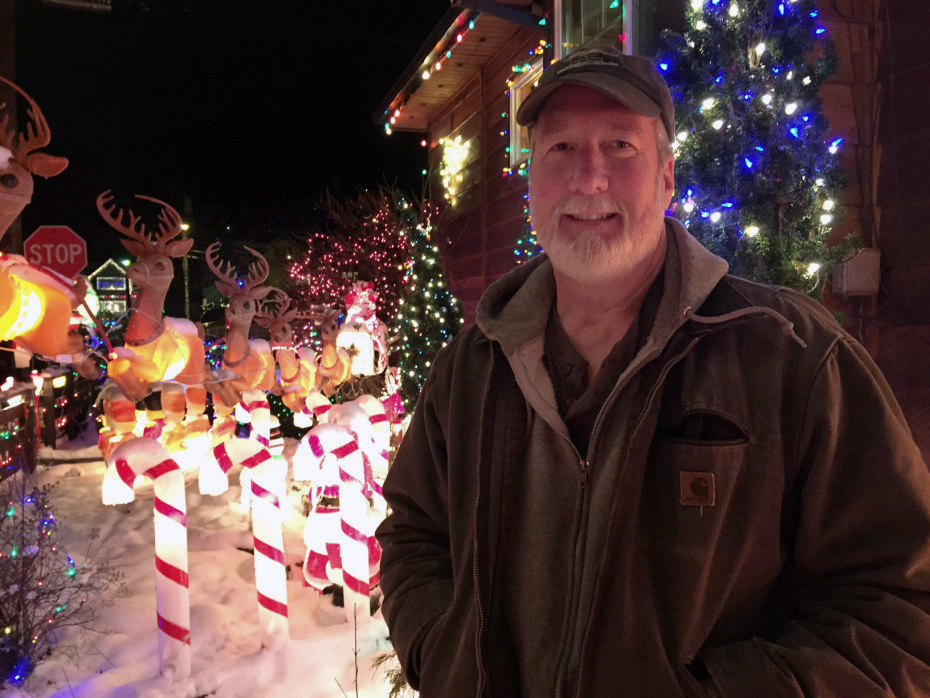 Originally from Long Island, N.Y., Jeff Campbell moved to Juneau in 1985. He’s been decorating his house since the early 1990s. (Photo by Lisa Phu/KTOO)