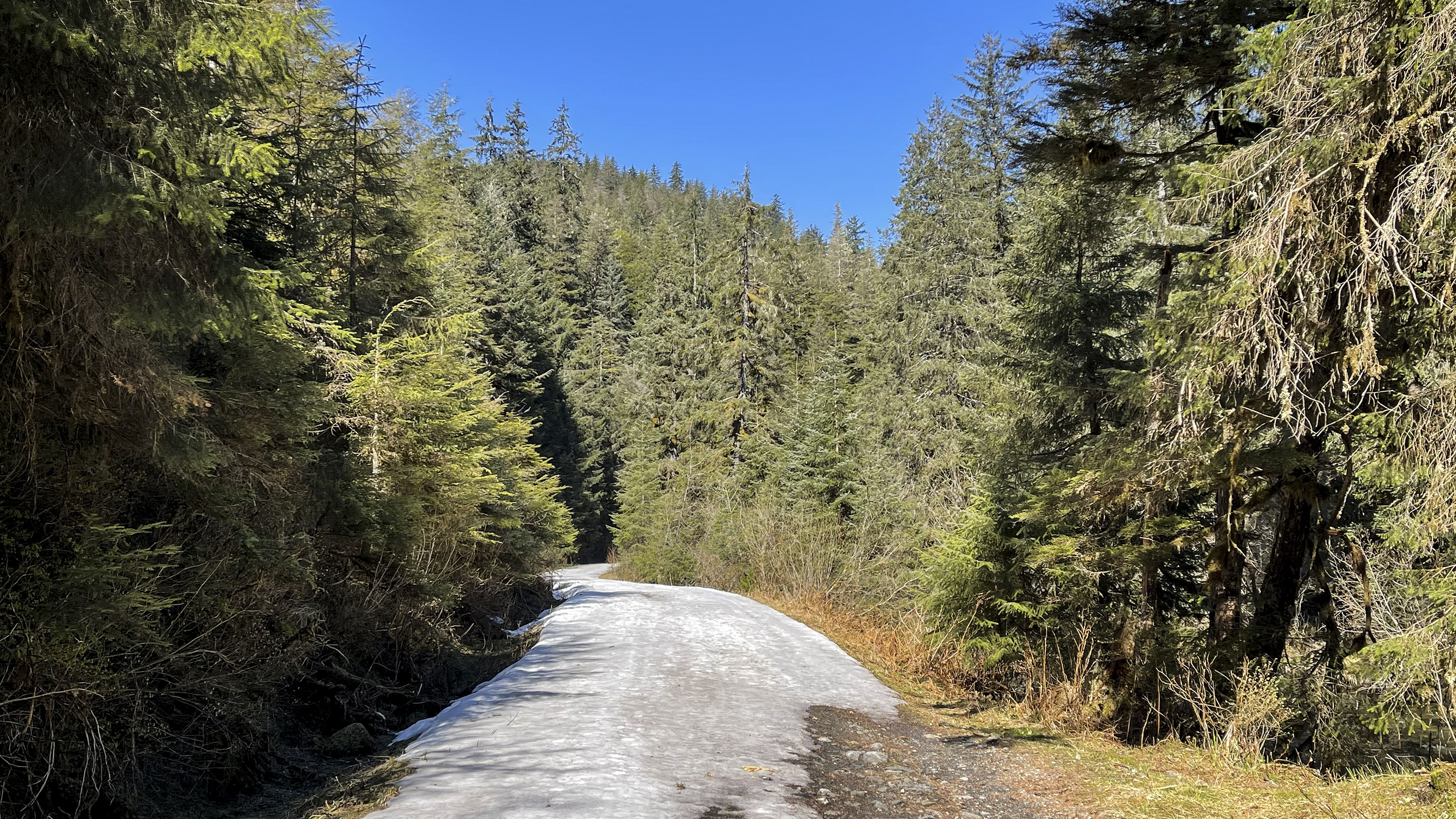 Snow and tracks on the Montana Creek trail on May 18, 2021, in Juneau, Alaska. (Photo by Rashah McChesney/KTOO)