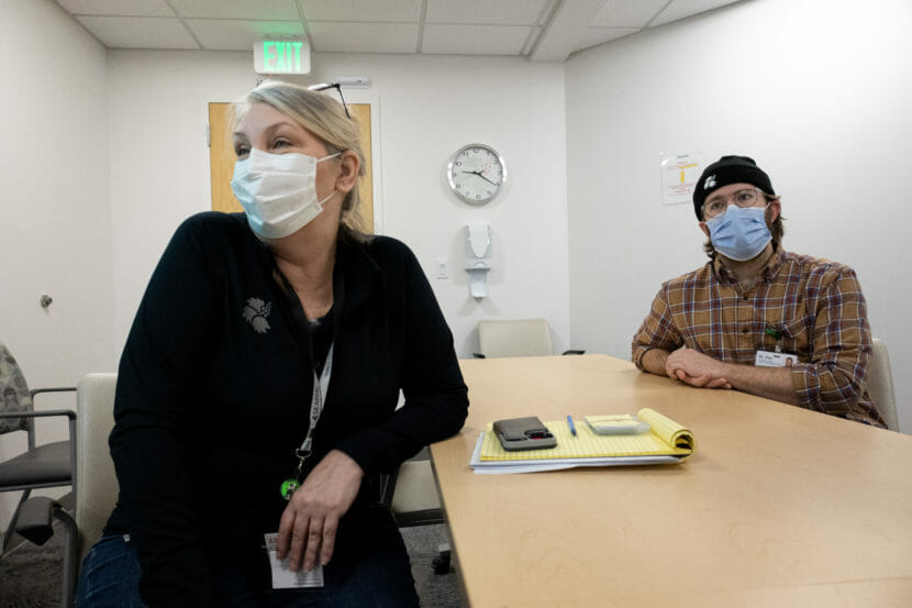 Claudette Thor and Corey Cox sit in a conference room in Southeast Alaska Regional Health Consortium’s new opioid treatment clinic in downtown Juneau, Alaska on April 1, 2022. (Photo by Lyndsey Brollini/KTOO)