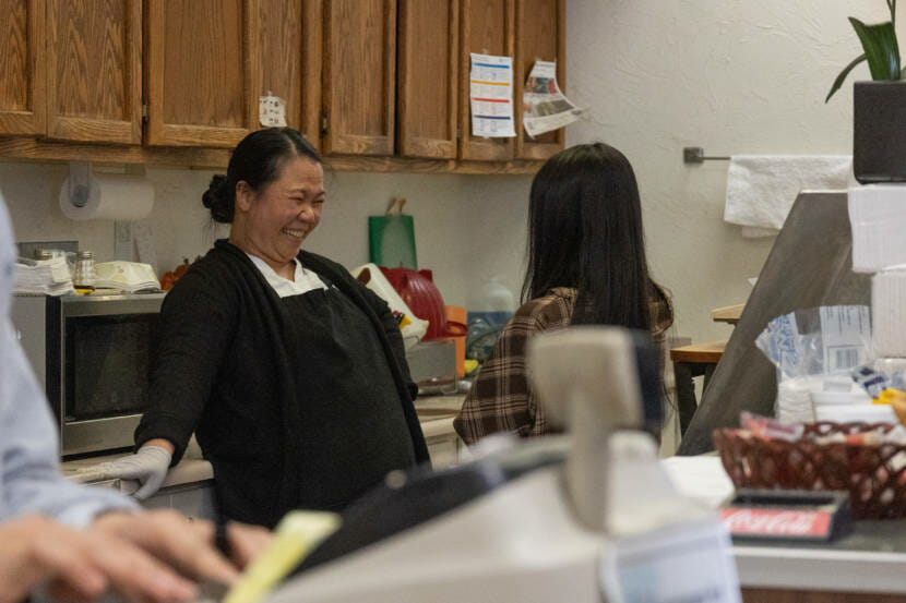 Neil Doogan, right, co-owner of J & J Deli and Asian Mart, works during the lunch hour in Juneau, Alaska on April 4, 2022. (Photo by Lyndsey Brollini/KTOO)