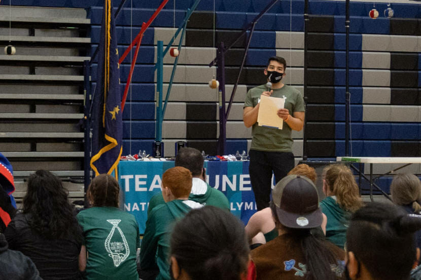 Kyle Worl speaks to athletes during the opening ceremony of the 2022 Traditional Games in Juneau, Alaska on April 2, 2022. (Photo by Lyndsey Brollini/KTOO)
